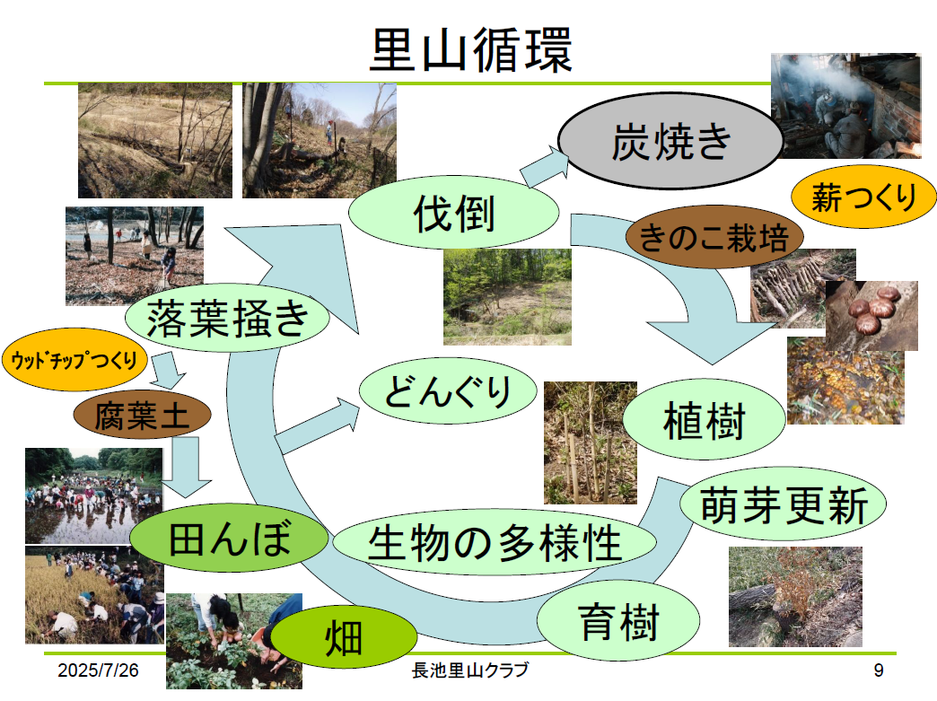 長池里山クラブは「良好な自然環境の保全」、「住民コミニティの形成」、「市民の手による里山文化の育成継承」の三つの柱を中心に活動を行っています。興味をもたれた方はぜひご参加ください。