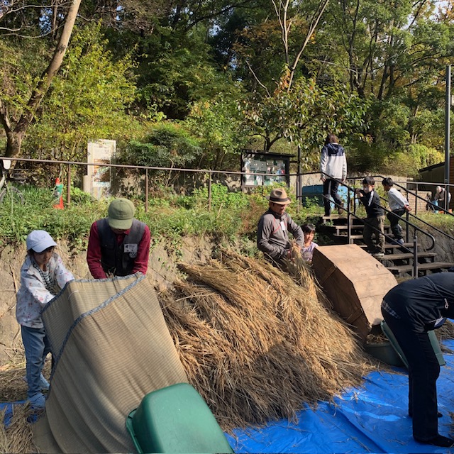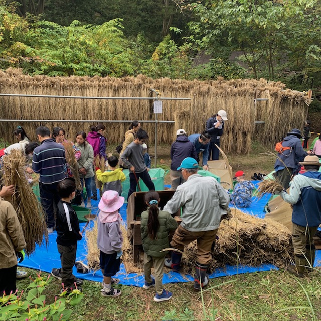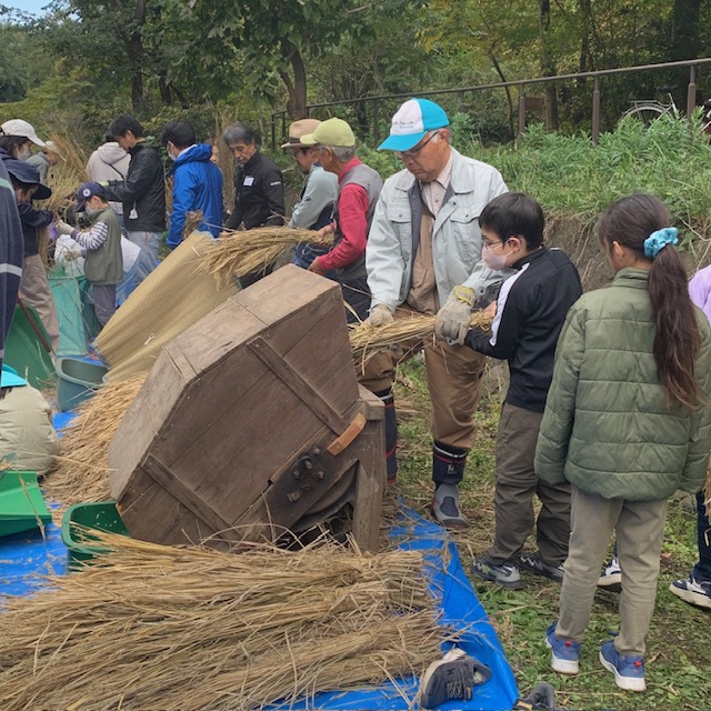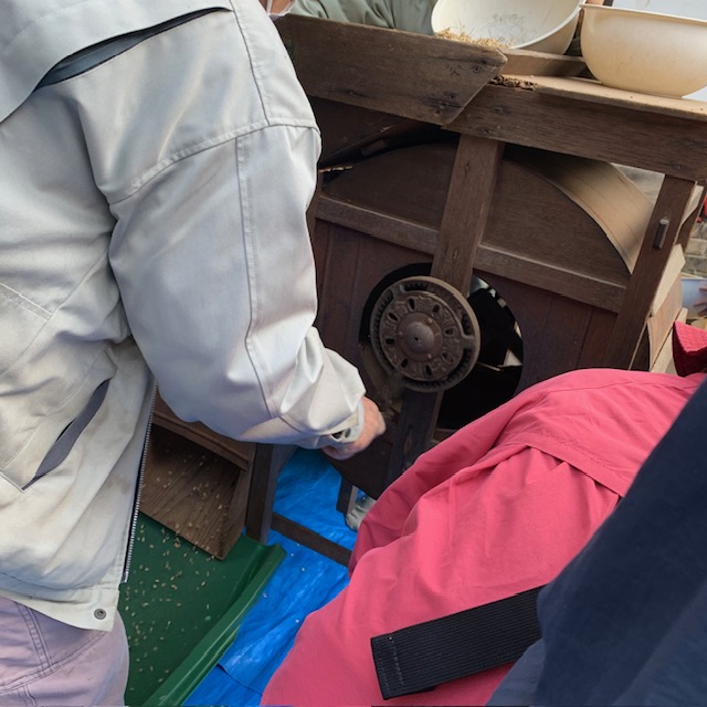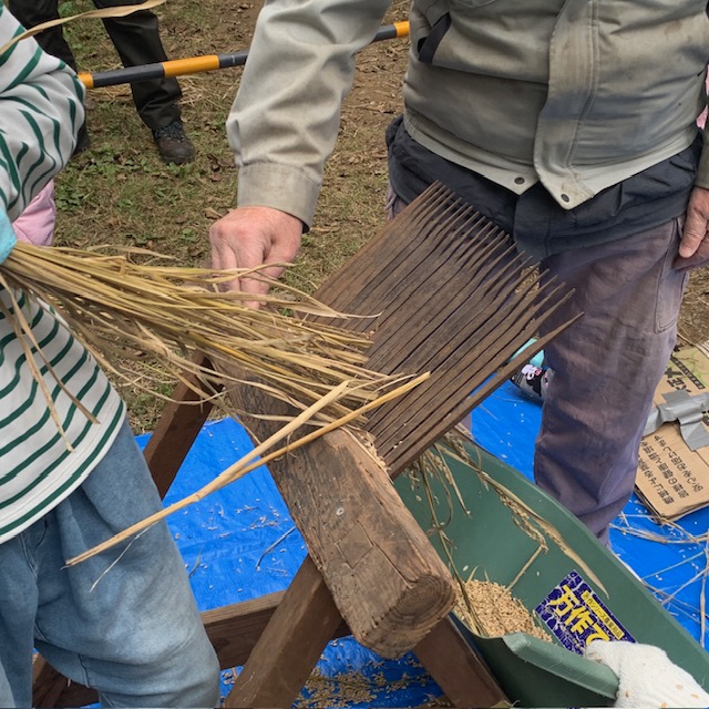 同じブルーシートの片隅では「千歯こき」(せんばこき)を使った脱穀の体験をおこなっています。足踏み脱穀機がすでに古式豊かな装置ですよね。長池里山クラブにはさらに古い時代の千歯こきがあるんですよ。昔の人はこんなことをしていたのだなあ~と感じ入るために体験します。