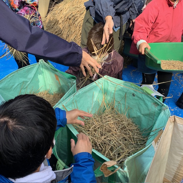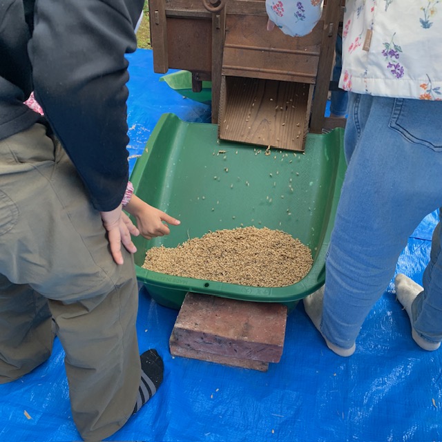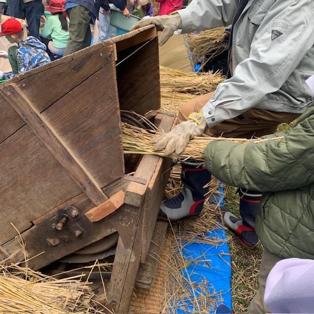 11月は、10月に稲掛けに掛けて干した稲の脱穀をします。籾(もみ)を稲から取り除くことを脱穀と言います。お米を食べるためにはさらに作業が必要で、籾すりをして外皮を取りのぞきます。この状態が玄米です。白いお米を食べたいときは玄米をさらに精米します。