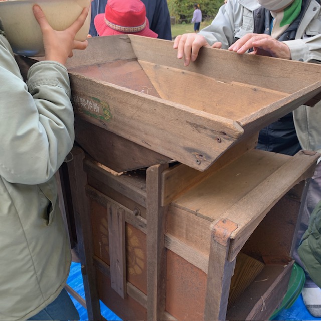 次の写真は「唐箕」という装置です。「とうみ」と読みます。足踏み脱穀機で取り除いた籾を集めただけの状態では細かな稲クズが混じっているため、その稲クズを風で吹き飛ばす装置です。