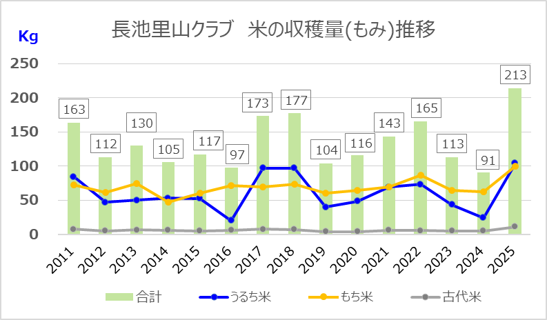 2025年の米の収穫量:うるち米104Kg、もち米99Kg、古代米11Kg、合計213Kgでした。(もみの状態)